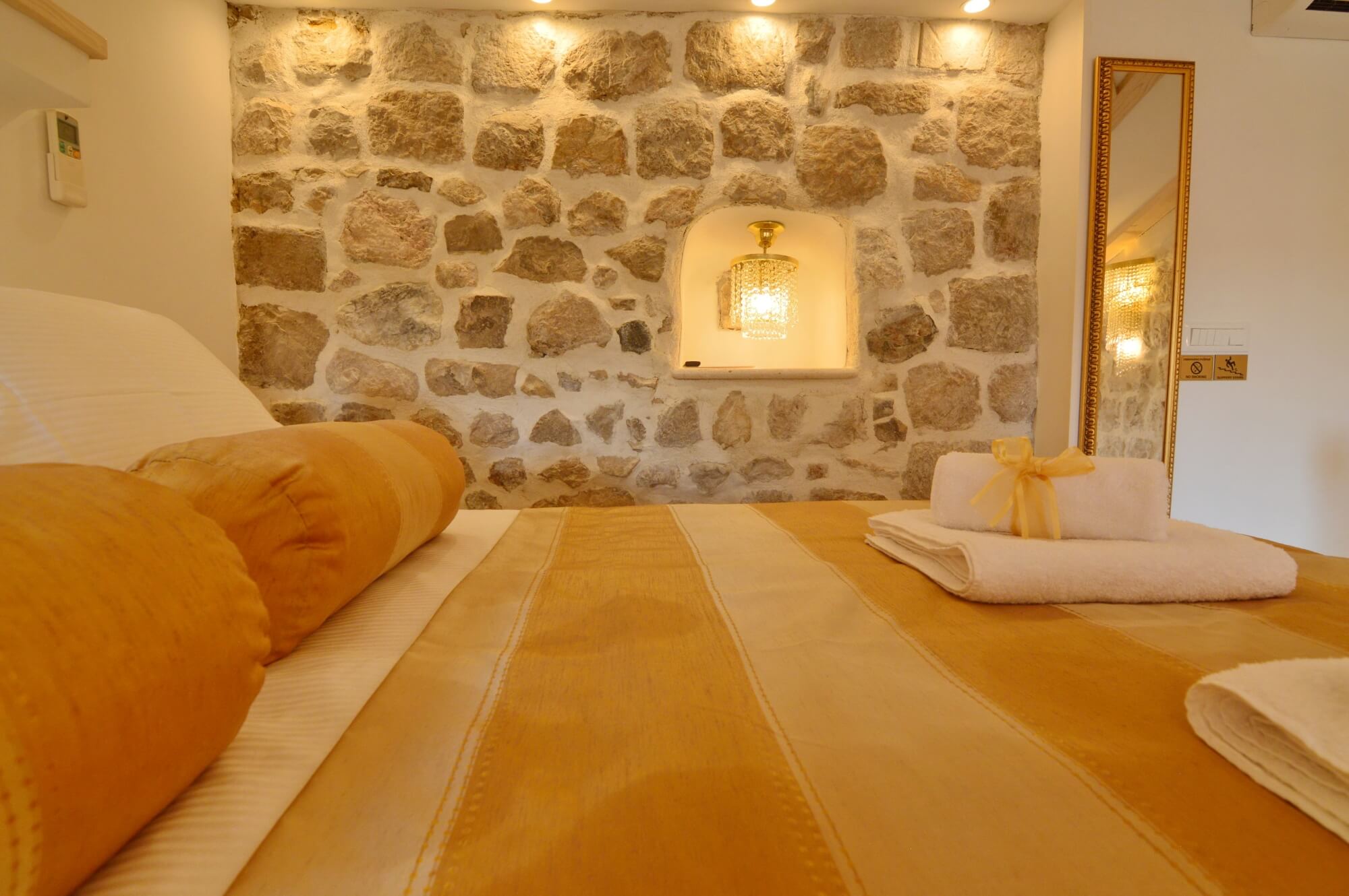 Newly renovated luxury apartment situated on the ground floor of the Villa. Carefully decorated with a combination of natural stone shades that elegantly overlap with the colors of old gold made to be your oasis of peace. Kitchenette, bedroom (1 large double bed – can be 2 separate beds), private bathroom, all equipped with everything you need. Enjoy beautiful cliff beach (Buža bar), with refreshing drinks only 1 minute from the apartment.